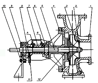 RY型熱油泵為單級懸臂式結(jié)構(gòu)分為腳支撐和中心支撐,泵的進(jìn)口為軸向吸入,出口為中心垂直向上。泵和驅(qū)動電機(jī)通過彈性聯(lián)軸器合裝于同一底座上。整個機(jī)組無需加冷系統(tǒng)。