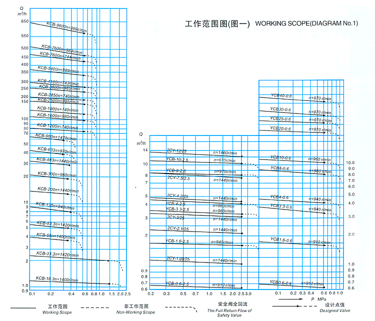 各型齒輪泵性能參數(shù)中給出的排出壓力是給出的大的工作壓力值,在此范圍內(nèi)泵均能正常工作,其工作范圍見圖一。
